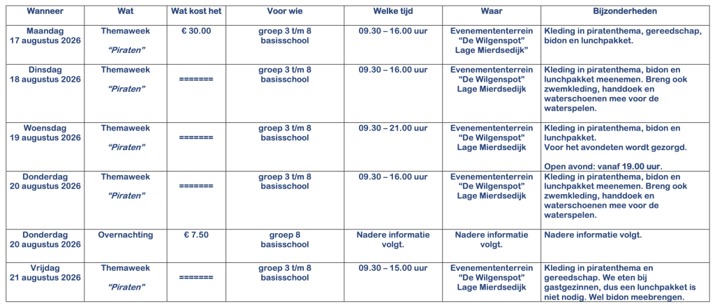 Tijdens de themaweek maken de kinderen van groep 3 t/m 8 kennis met onze rolspelers. Dit jaar nemen we onze zeebenen en gaan we samen met de kapitein en zijn piraten op avontuur. We gaan op zoek naar een schat. Zullen we deze ook vinden?